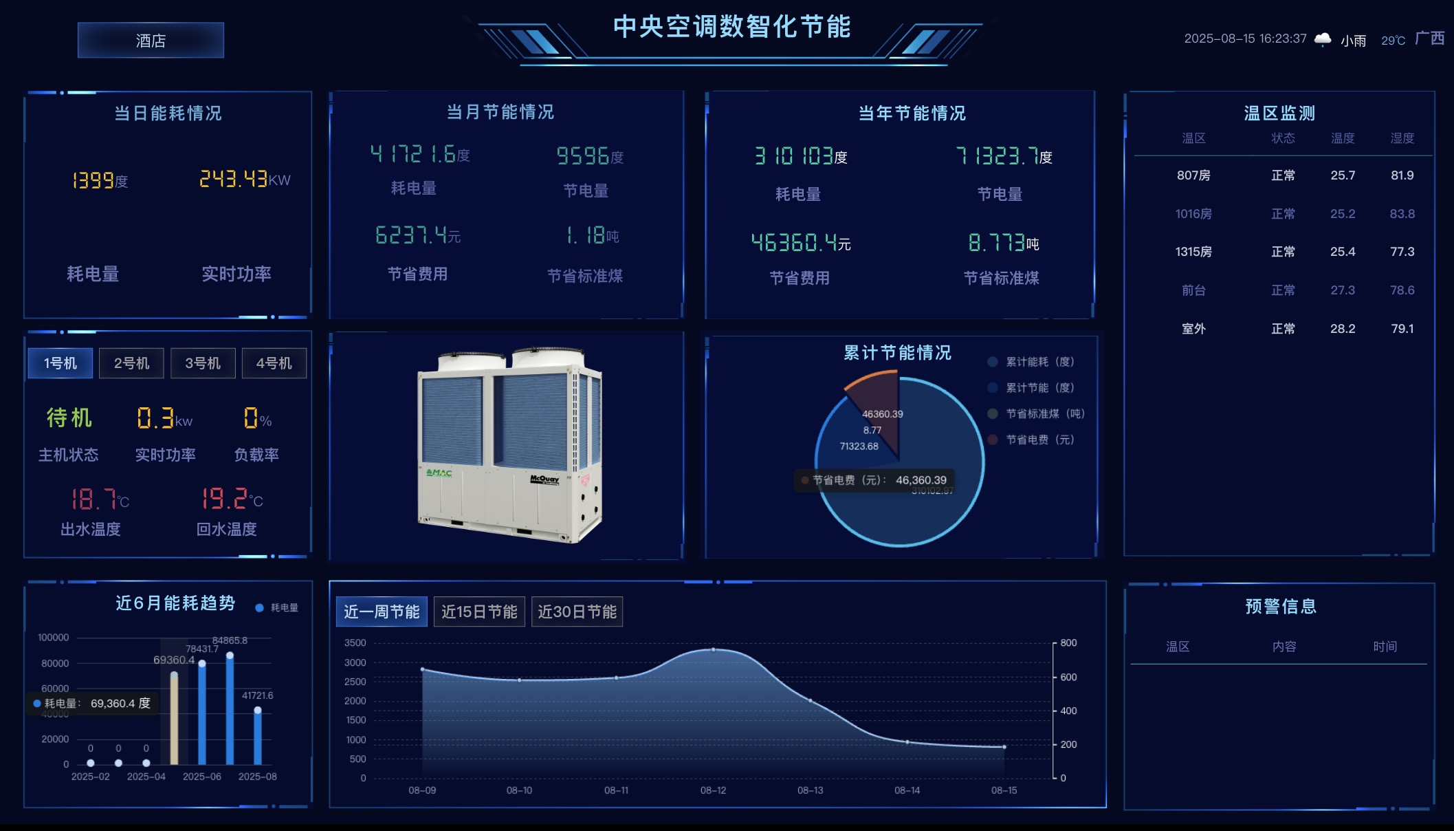 The MCU collects operational data from central air-conditioning chillers and facilitates automatic energy-saving actions. It evaluates cooling and heating demand using data processed through the carbon and energy-saving cloud platform, supported by edge computing infrastructure.
